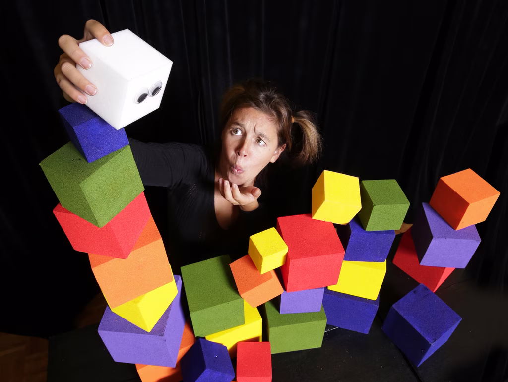 Au…Hee, kleine witte kubus, wie ben jij?? Olleke! Kom, ik zal je alle kleuren laten zien. Wil je weten hoe het is om geel te zijn, lekker vrolijk en vlug?! Weet je wel dat rood heel stoer en sterk is? Wat vind je van blauw? Mooie kleur hè?… Die kan heel streng zijn! Paars dan?… Dat is pas bijzonder… Maar er is nog veel meer. Ik zal een wereld vol kleur voor je maken.