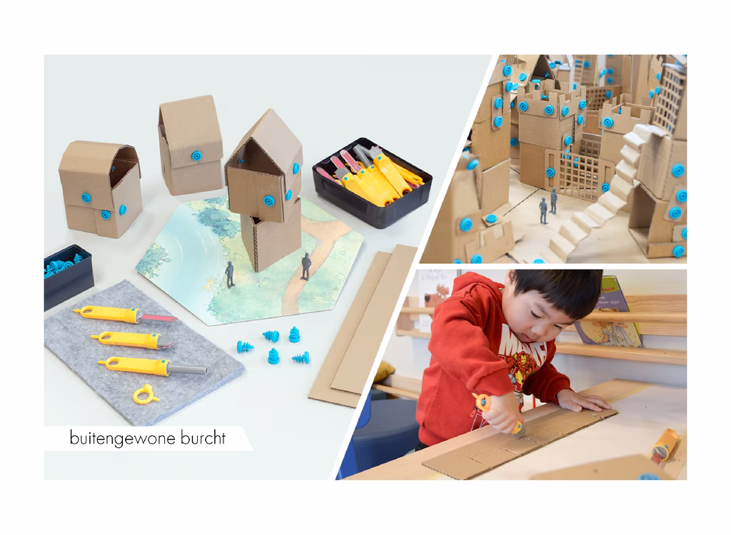 Maak vanuit een plat vlak een 3d huisje! Lukt dat met zagen en schroeven? En wat gebeurt er als we deze huisjes bij elkaar zetten? We beelden ons in dat dit een middeleeuws dorpje is. Wat ontbreekt er dan nog? Zaag kantelen, schroef dakplaten en verbind huizen met hangbruggen! Buitengewone burcht laat kinderen onderzoekend en ontwerpend technieken ontdekken.